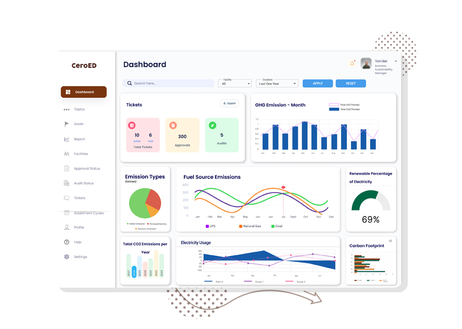CeroEd is a climate technology company that offers ESG tracking and goal setting options via its SaaS platform. The system was created to help large and medium-sized companies achieve their Net Zero emissions and ESG objectives. Our cutting-edge software is created to precisely measure and track carbon emissions and assist organizations in achieving their ESG goals across their various operations, processes, and sites.